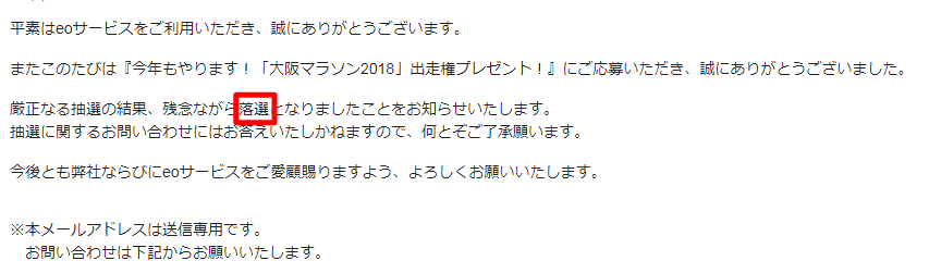 以前の記事に書いた通り、ケイ・オプティコム「大阪マラソン2018」出走権プレゼントに応募していたのですが、その抽選結果がメールで届いていました。
