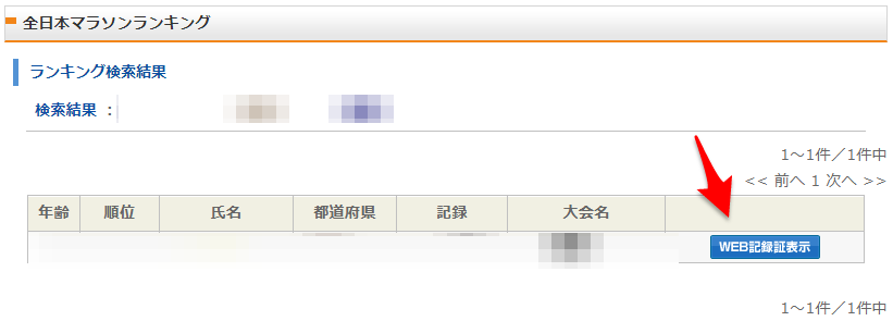 順位や記録が表示されますが、全体の人数がわかりませんので、【WEB記録証表示】ボタンを押します。