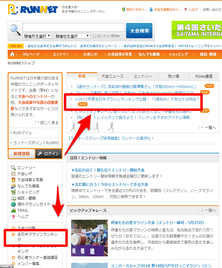 トップページからだと、新着の欄か、左の方に「全日本マラソンランキング」というメニューがあるので、そこをクリックします。