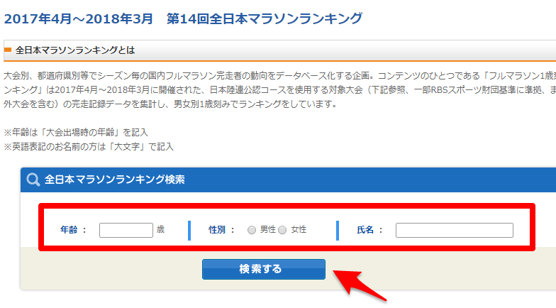 - 年齢は一番良いタイムで走った大会に出場したときの年齢を入力します。