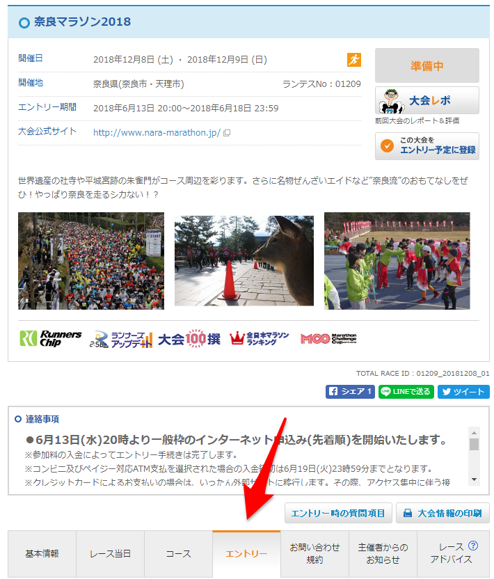 RUNNETにログインしたら【奈良マラソンの大会ページ】で【エントリーのタブを】開き、ページ中程の【エントリー種目】を表示させて20時を待ちましょう。