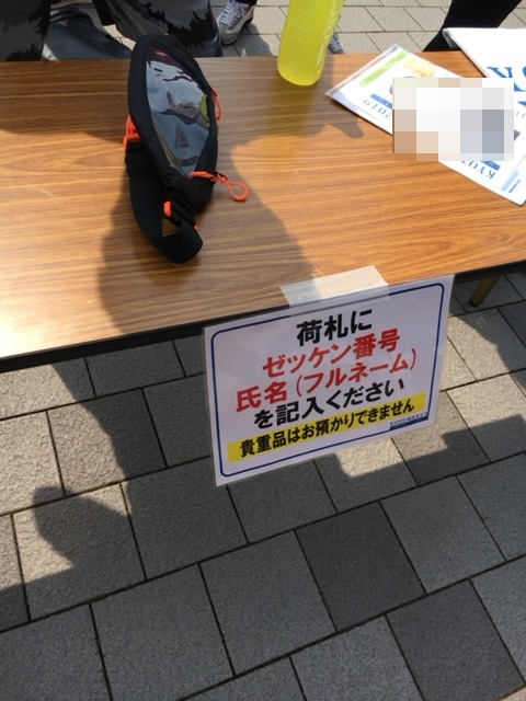 荷札にゼッケン番号と名前を書いて荷物にくくりつけてテントにいるスタッフさんに渡します。