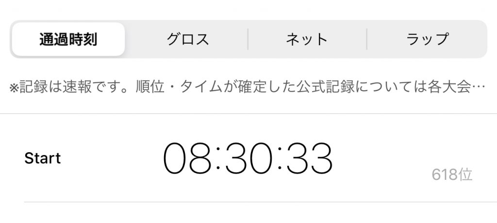 応援ナビの通過時刻は8:30:33、号砲が8:30だったので、スタート地点を通過するまで33秒かかっています。
