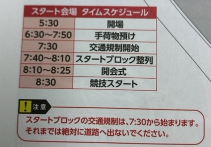 スタート会場 タイムスケジュールによると、スタートブロックへの整列は7:40からなのですが、私が並んだのは8:00ごろでした。