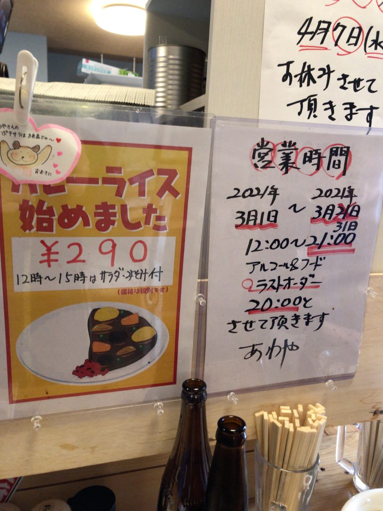 通常は毎日12:00から21:00までの営業ですが、時短要請などにより変更になりますので、来店される際はHPをご確認下さい。